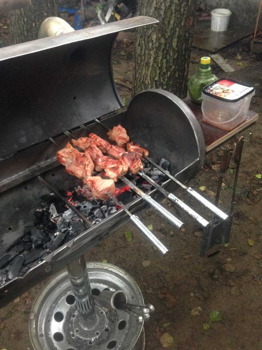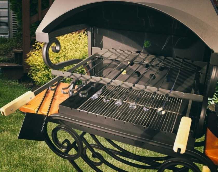 Шашлык можно готовить как на углях, так и на дровах. Крепления для шампуров расположены на боковых стенках, а внутри размещены решетки, которые предотвращают контакт мяса с топливом. Прямо над жаровней можно поставить решетку, чтобы готовить не только шашлыки, но и блюда в кастрюле или казане.