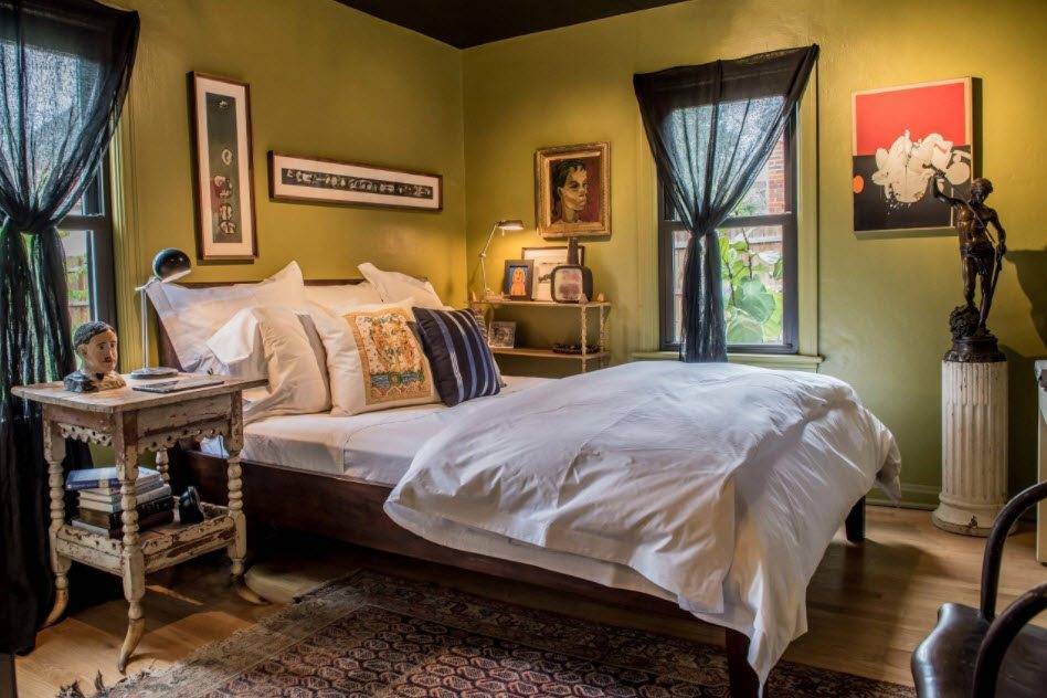 В спальне вы можете позволить себе темные цвета, даже черный по принципу, что используете более глубокие и насыщенные расцветки в комнатах, где проводите время, в основном вечером и ночью. Темные цвета спальни являются четким сигналом того, что это особое место тишины и ночного отдыха. Белый, пастельный диапазон, нейтральные оттенки, расслабляющие зеленые и голубые, серо-голубой, бирюзовый, пурпурный, красный также рекомендуются для спальни.