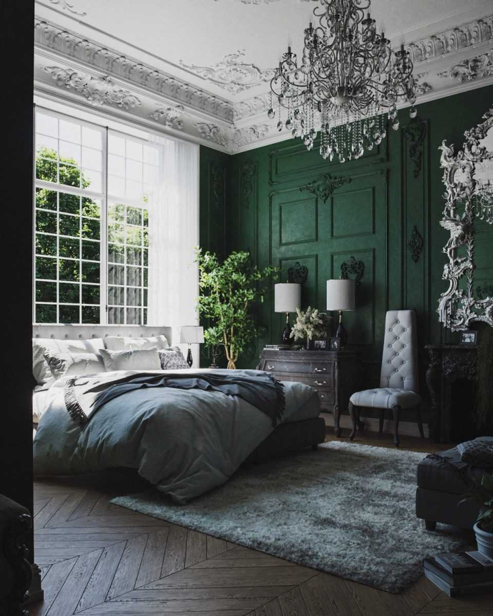 Женщине 70-лет больше приглянутся светлые шелковые обои. Дополнит интерьер, скорее всего, светло-зеленый текстиль. Спальня станет грациозно помпезной.
