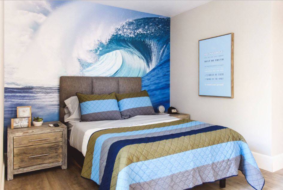 Спальня, оформленная в цветах моря и солнца, создаёт позитивный настрой, даёт дополнительную энергию. Если в интерьер добавить зелень живых цветов, создастся ощущение присутствия на морском побережье.