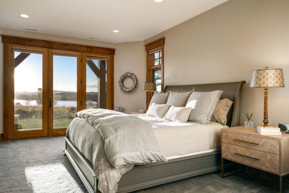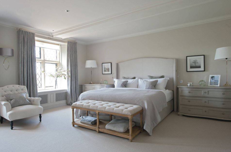 Серый. Такое дополнение сглаживает формальность интерьера спальни в бежевых тонах. Этот вариант идеален для просторных помещений. В маленьких комнатах стоит ограничить количество серого. Его целесообразно заменить на серебристый, и задействовать в таких деталях: ручки мебели, спинки или ножки стула, кровати, обрамления картин.