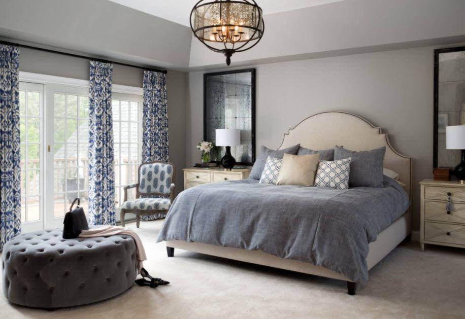 Синий. Подходит для применения в современных стилях интерьера. Оригинально впишется в хай-тэк. Таким же тоном выделяют узоры на занавесках, накидках на кровать и некоторую мебель. Нередко синего цвета выбирают пастельное белье для бежевой спальни