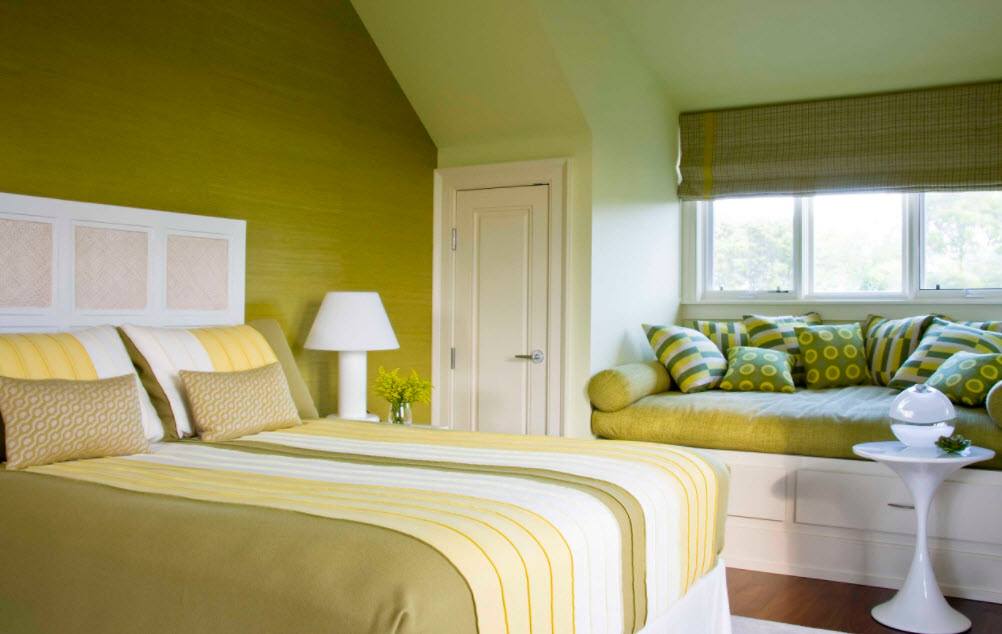Выбирая голубой цвет в качестве основы, а нежный тёплый оттенок зелёного качестве дополнительного и добавив аксессуары пастельных или бледно-жёлтых оттенков, ваша спальня превратится в комнату, где царит лето.