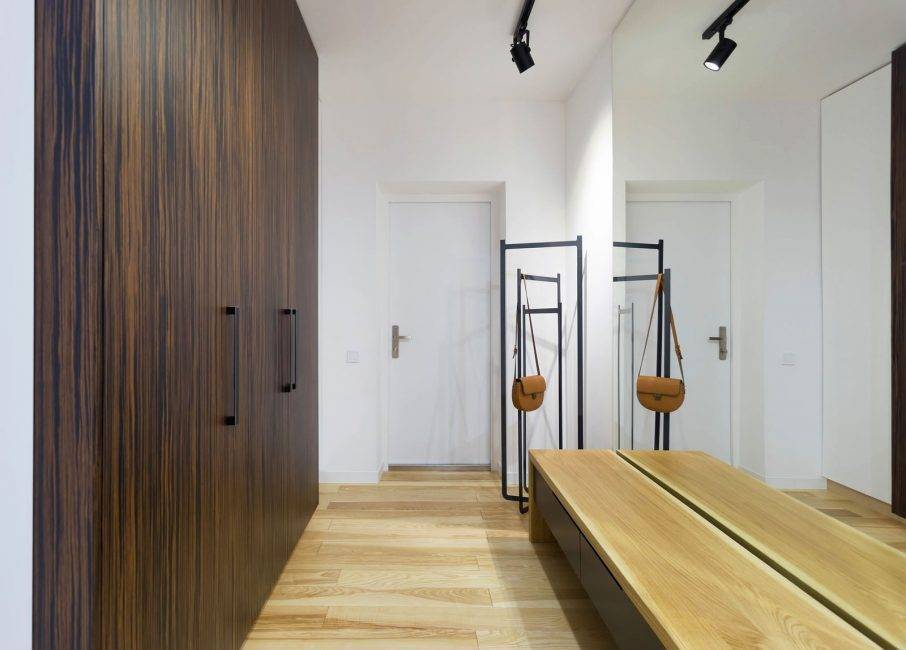 В узкой прихожей не советуют ставить громоздкие тумбы с зеркалами. Зеркало вешают на стену или делают зеркальной входную дверь. По стенам размещают неглубокие ящички для обуви со специальными отсеками для хранения. Над дверью — антресоль. Вешалку для одежды с крючками и штангой для плечиков монтируют на стену.