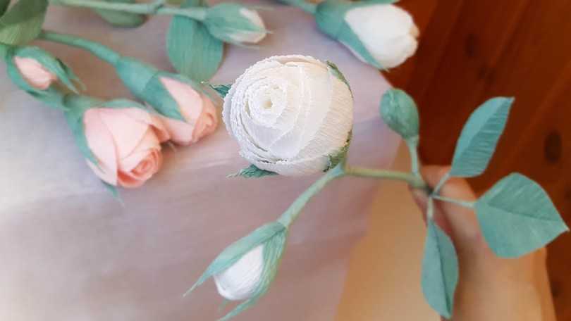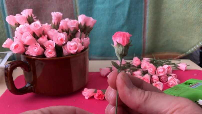 Таким образом получается вполне пушистая роза, что позволяет использовать ее в качестве отдельного цветка, к которому следует прикрепить стебель и чашечелистник, предварительно собранных из зеленой бумаги.