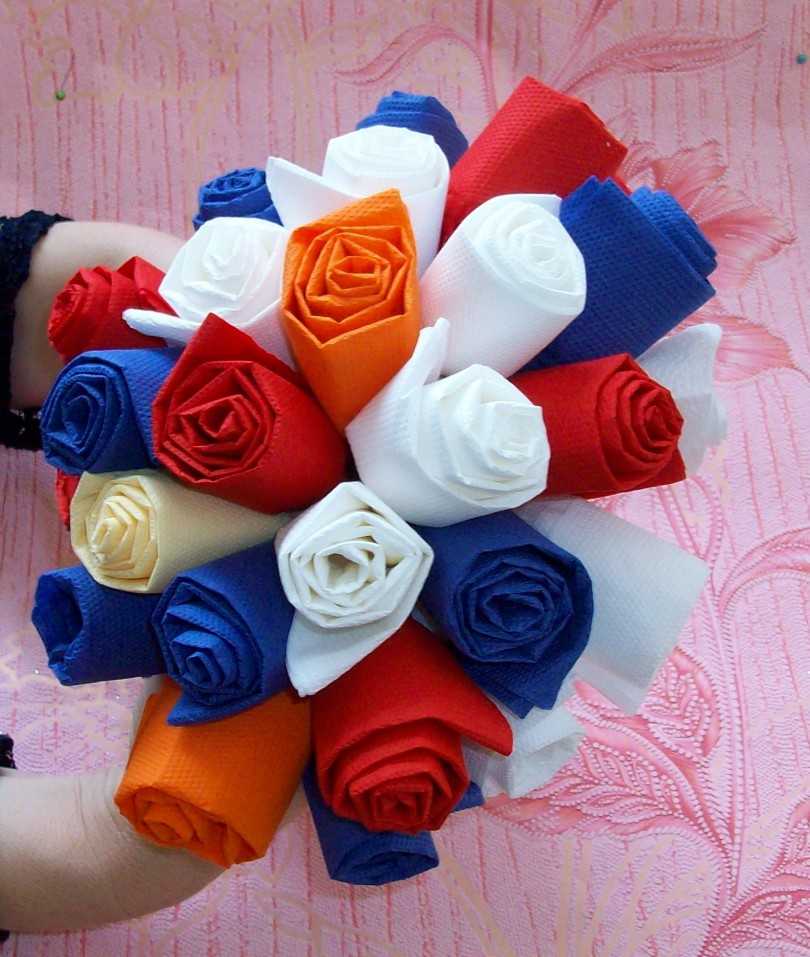 Также декоративные салфетки дают несколько вариаций по сворачиванию поделки. Цветочки получаются нежными и ажурными.