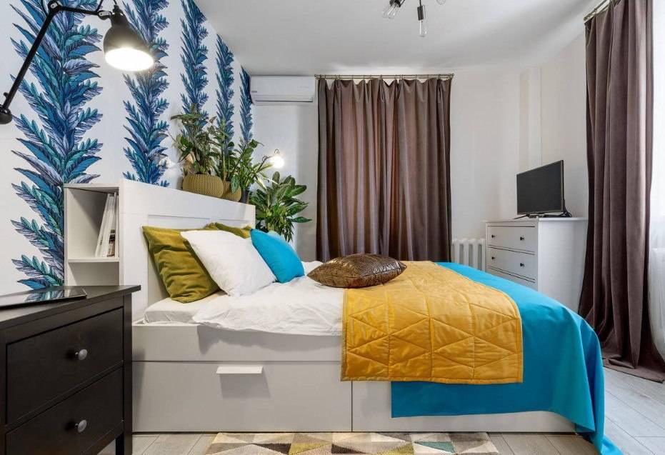 Небольшие помещения следует оформлять в светлых тонах. Исключением может стать использование темных оттенков на одной из акцентных стен. Такой дизайнерский секрет добавит дополнительной глубины помещению и приумножит свободное пространство, как видно на фото интерьера однокомнатной квартиры 20 кв.м.
