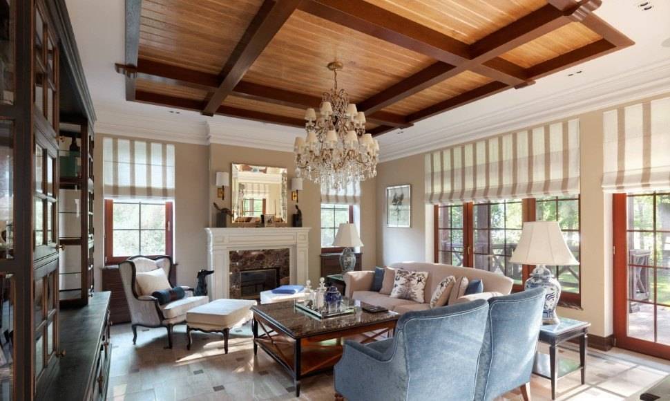 - для отделки используют только натуральные материалы. Пол выполняют из дерева или камня, стены штукатурят, красят или облицовывают камнем около камина, потолок оставляют окрашенным или оштукатуренным, часто его украшают деревянными балками;