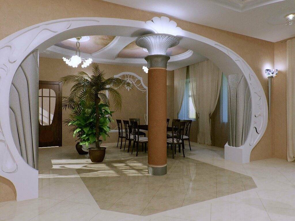 Часто на такой арке можно встретить различный декор, завитки или рисунки. Но подойдет такая роскошь только для действительно больших помещений.