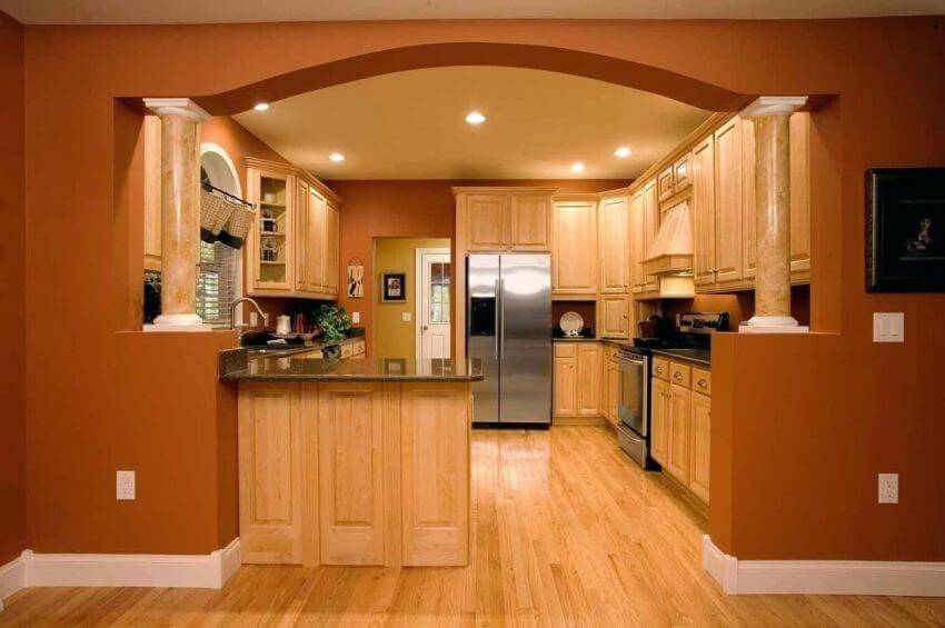 Прежде всего, обратите внимание на стилистику помещения. Например, классическая кухня хорошо сочетается с аркой из дерева или гипсокартона