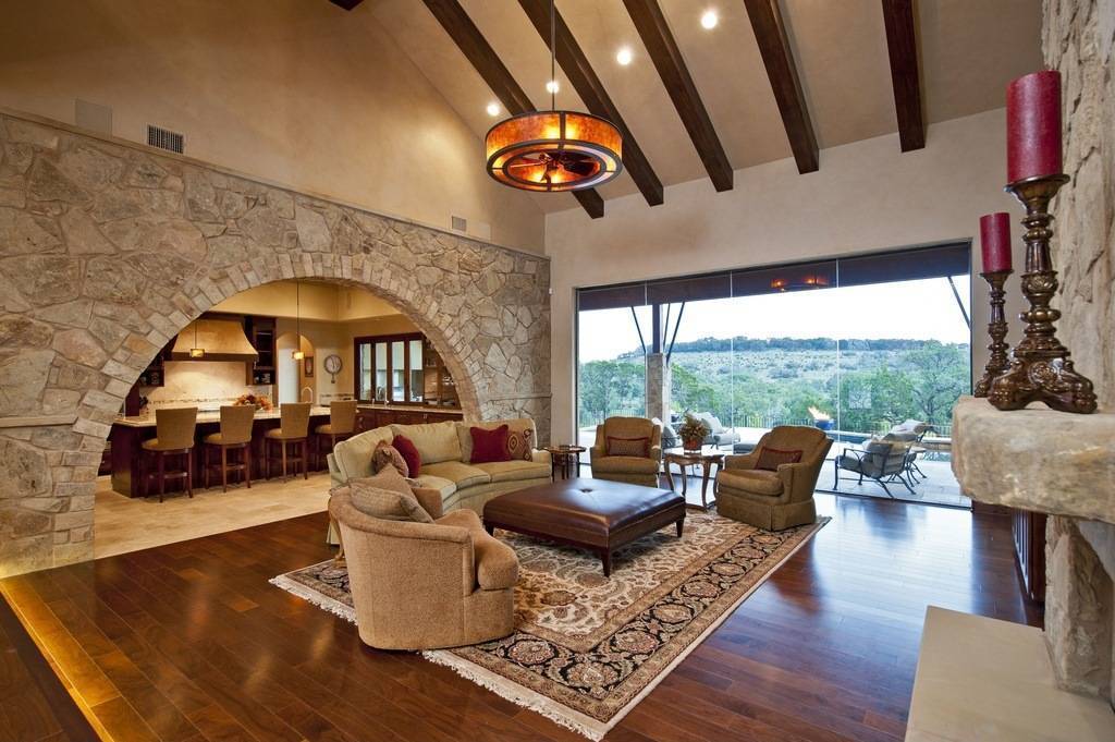 Средиземноморская гостиная отличается другим дизайном арки. В этом случае конструкция выполнена из кирпича и камня. Это привносит текстуру в декор, а также добавляет немного деревенского очарования в комнату. Окна могут быть также арочными или панорамными на всю стену.