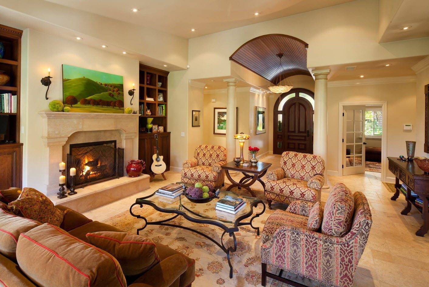 Красивая гостиная в классическом стиле имеет арочный вход, и это очень элегантная деталь, особенно в случае изысканного интерьера. Гостиная отличается традиционным элегантным дизайном с внедрением современных акцентов. Чаще всего арка украшает комнаты в традиционном стиле. Потолок прекрасен, а колонны и арочные стены также являются изысканными деталями. Вся комната напоминает роскошное, утонченное пространство. Большая подвесная люстра является центром, но на самом деле выделяется весь декор.