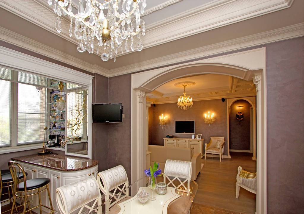 Достаточно концептуальным решением является плавное соединение линий потолка, проходящей сквозь арку на барную стойку. Благодаря этому приему можно создать динамичный интерьер, где каждая отдельная деталь будет связана в единый элемент.