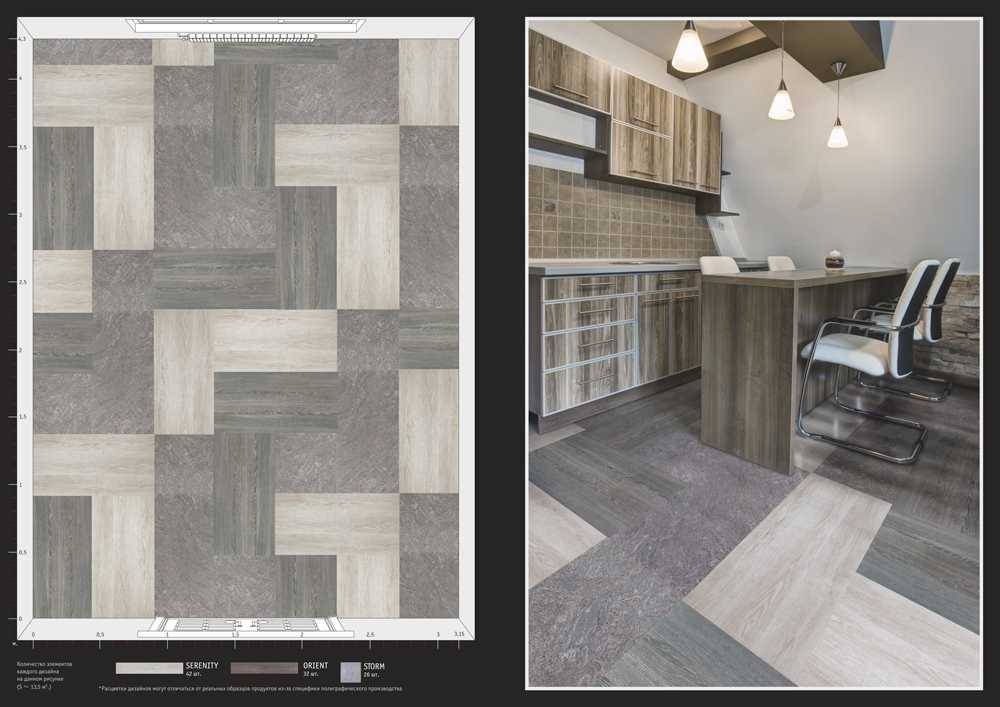 Ключевая особенность креативной ПВХ плитки Tarkett — модульный формат. Такое построение дает возможность комбинировать различные декоры в одном помещении, создавать уникальные композиции. Кроме того, при повреждении напольного покрытия меняется лишь одна плитка, не нужно перестилать весь пол.
