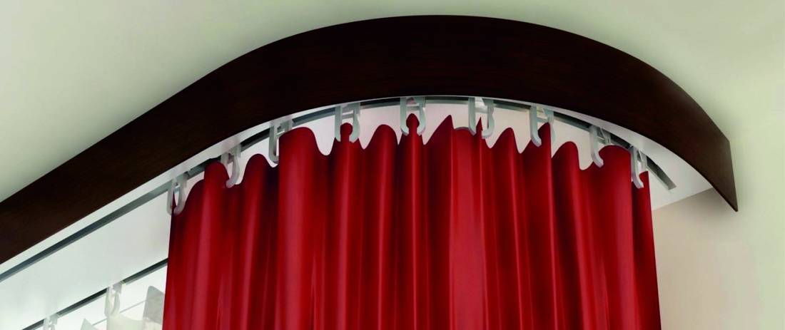 - Внешний вид и структура. Багетки, или багетные карнизы, для штор бывают однотонные и цветные, гладкие и рельефные. Для оформления окон в эркере выпускают вогнутые модели. Помимо прямых планок, иногда шторы закрывают фигурными конструкциями.