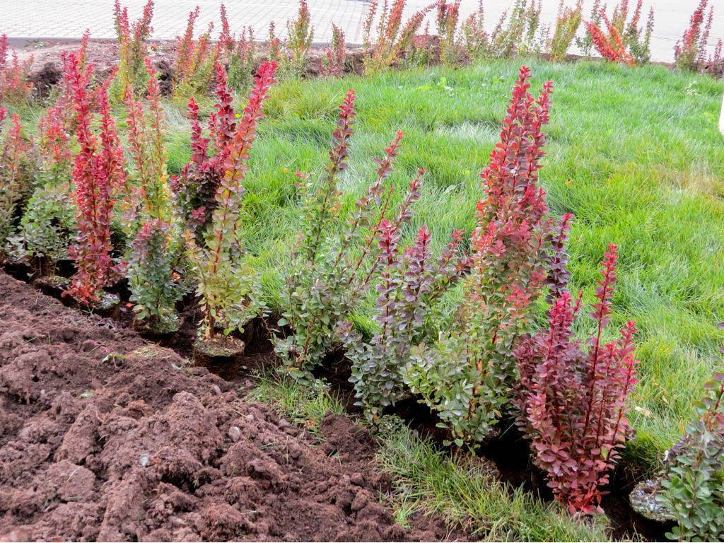 - Барбарис с листьями красных оттенков высаживают для контраста.