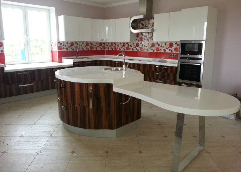 Чаще открытая угловая стойка, перпендикулярная основной линии кухни. Высота такой барной стойки как раз +15-20 см. к высоте столешницы. Изготавливают кухонщики. Материал столешницы тот же, что и у кухни.