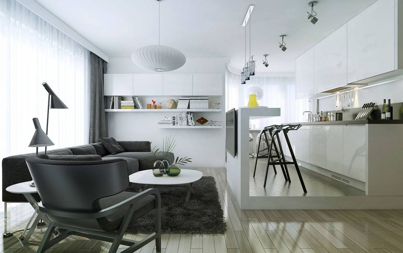 Барная стойка в паре с подвесными светильниками прекрасно подходит на роль разделителя пространства кухни-гостиной