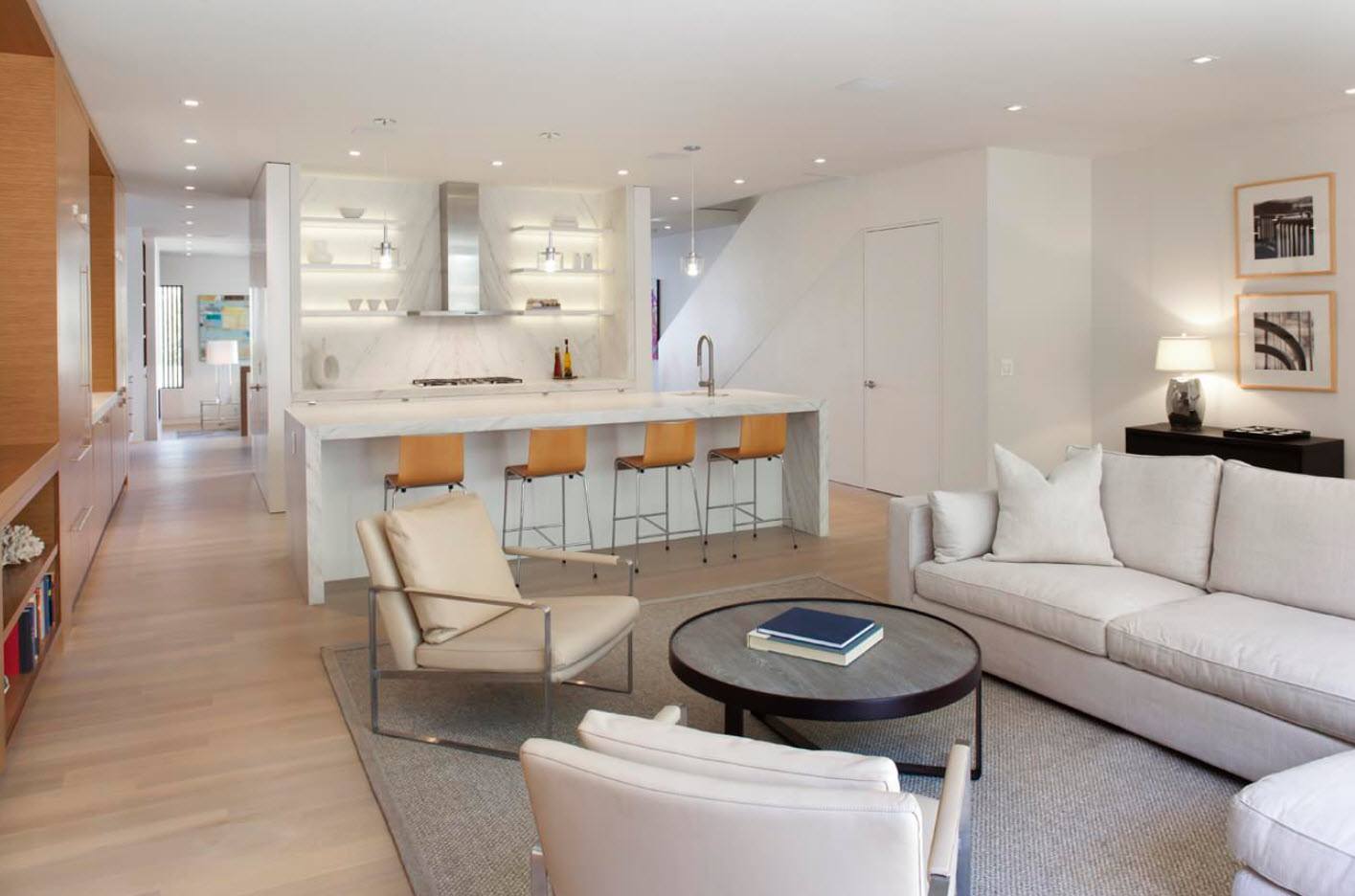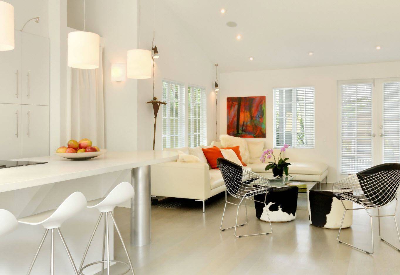 - Минимализм. Барная стойка в этом стиле должна состоять из столешницы и нижней функциональной части с нишей для хранения различных предметов. Столешницу барной стойки можно расположить перпендикулярно кухонному гарнитуру и сделать её продолжением рабочей зоны. Стойка создаст дополнительное место для готовки и с успехом заменит габаритный обеденный стол. К стойке необходимо подобрать барные стулья лаконичной формы и сдержанной расцветки. В этом стиле интерьера уместно будет смотреться кухонный гарнитур с ровными глухими фасадами белого или серого цвета. В гостиной части можно расположить белый кожаный диван строгой формы, пару кресел в таком же стиле, если позволяет пространство, компактный журнальный столик из дерева и несколько настенных полок для хранения предметов. Строгая и минималистичная обстановка — идеальный вариант для дизайна кухни и гостиной небольших размеров.