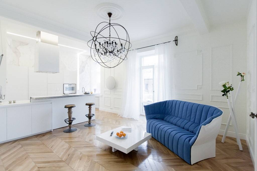 Ниже представлены фото красивых интерьеров квартир с кухнями, совмещёнными с гостиными.