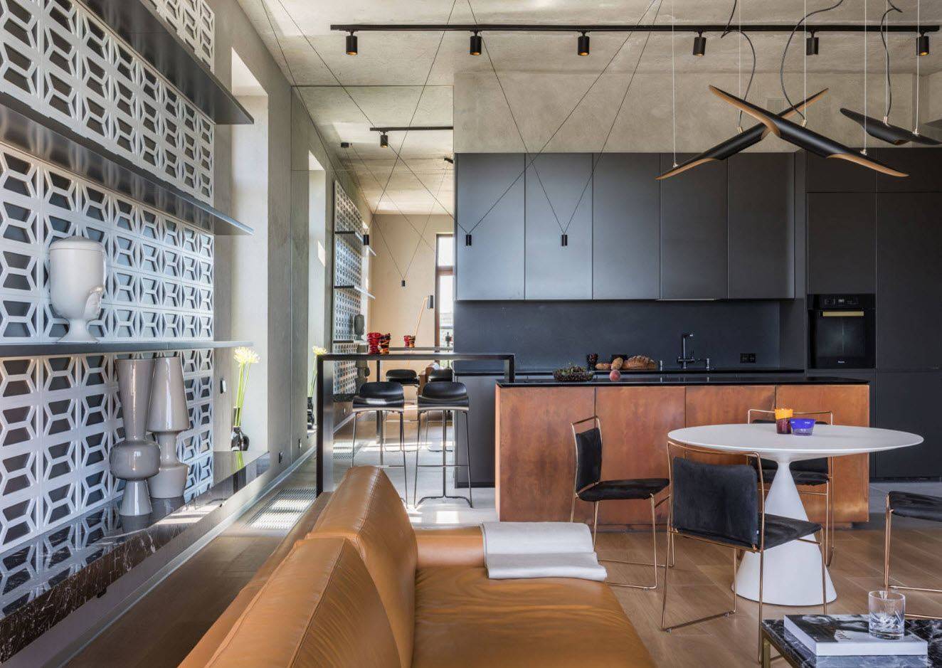 Барная стойка — это изящный, модный и функциональный элемент интерьера. Она идеально подходит для разделения совмещённой кухни-гостиной на две функциональные зоны. Барная стойка способна добавить «изюминку» в любой интерьер кухни-гостиной.