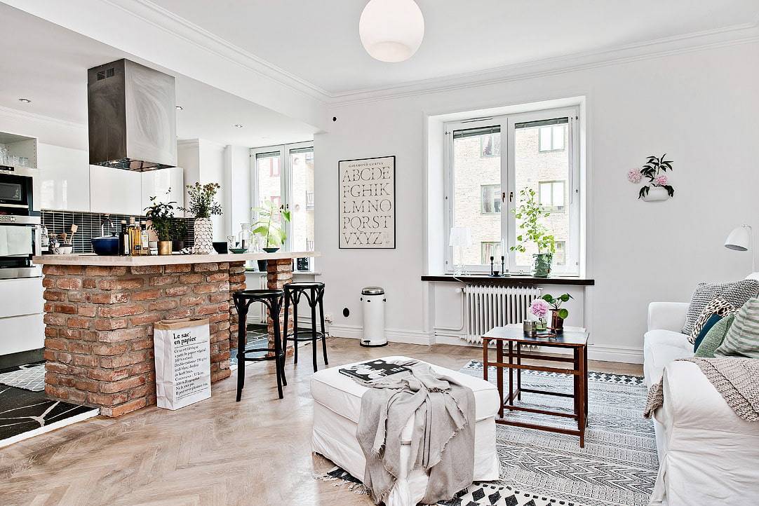 Если уж совсем не хочется привлекать внимание к барной стойке, со стороны гостиной к ней можно вплотную придвинуть диван и поставить его спинкой к кухне. В примере на фото на виду осталась только столешница, которая совсем не портит интерьер