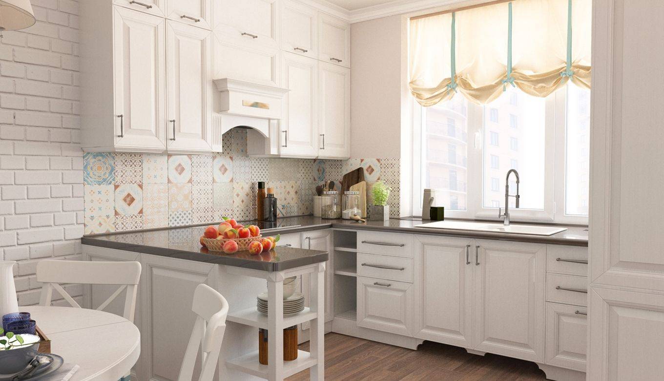 - Средиземноморский стиль. Весь интерьер оформляется в светлой гамме. Сочетание белого, светло-голубого и бежевого позволяет создать воздушную и просторную атмосферу в помещении. Эффектным разграничителем пространства в этом стиле станет большая арка, нижняя часть которой будет плавно переходить в барную стойку прямоугольной формы. На поверхности стойки можно поместить хлебницу и вазу с конфетами или фруктами. Столешницы можно изготовить из натурального или искусственного камня цвета графита. Аналогичной расцветки можно подобрать и керамогранит, используя его в качестве материала для отделки пола. Кухонный фартук рекомендуется отделать плитой нежно-голубого цвета.