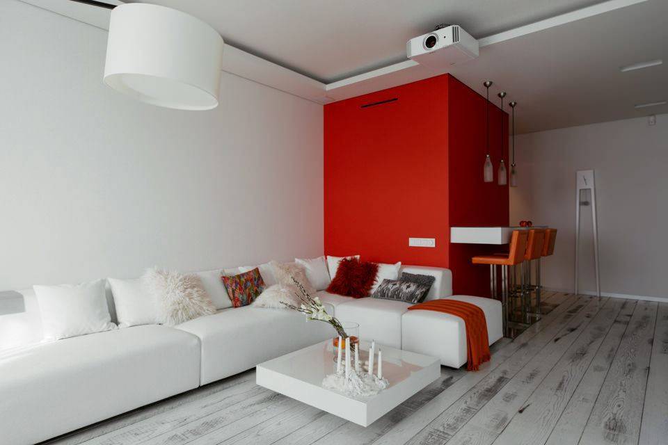 Если барная стойка в гостиной используется именно для размежевания основного помещения и кухни, ее обязательно выделить визуально. Способов для этого дизайнеры предлагают достаточно: цвет, фактура материала, подсветка. Но обо всем по порядку.