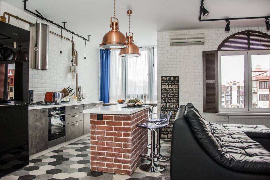 - Лофт. Подходит больше для больших помещений. Предполагает наличие потолочных деревянных балок, деревянного напольного покрытия (или имитирующего ламината), стен с отделкой кирпичной кладкой, больших открытых окон, просторного дивана и компактного журнального столика. Барная стойка может быть с деревянной столешницей и основанием, облицованным кирпичной кладкой. Над ней должны висеть низкие потолочные светильники, на её поверхности в качестве декора ставят вазы с фруктами и подставки для бутылок.