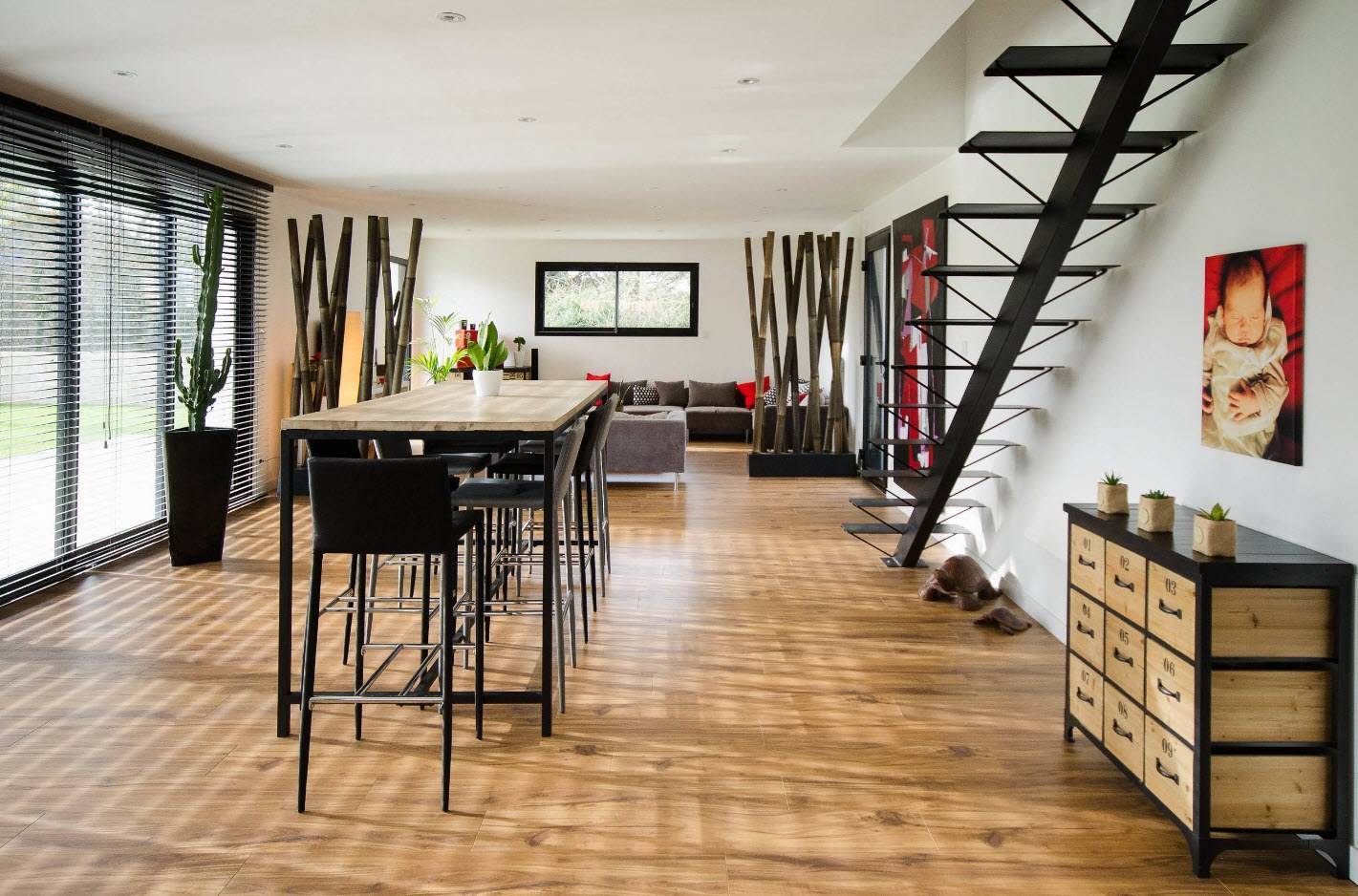 Такие стойки часто используются вместо обеденного стола. Главное отличие стандартного варианта мебели — небольшая высота. Изделия могут быть дополнены нижними полками или ящиками. Если вам нужно оборудовать маленькую комнату, то конструкция станет отличным помощником в этом. На фото видно, как удачно смотрится барная стойка-стол для кухни-гостиной.