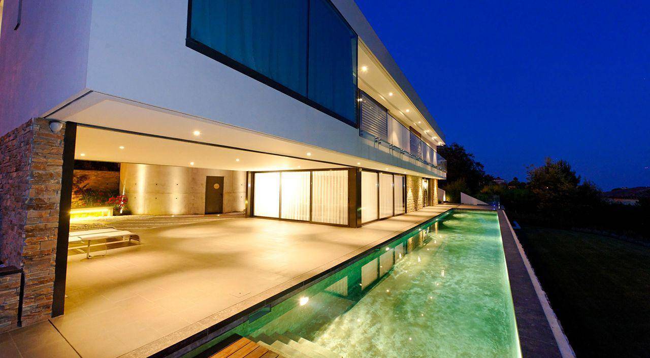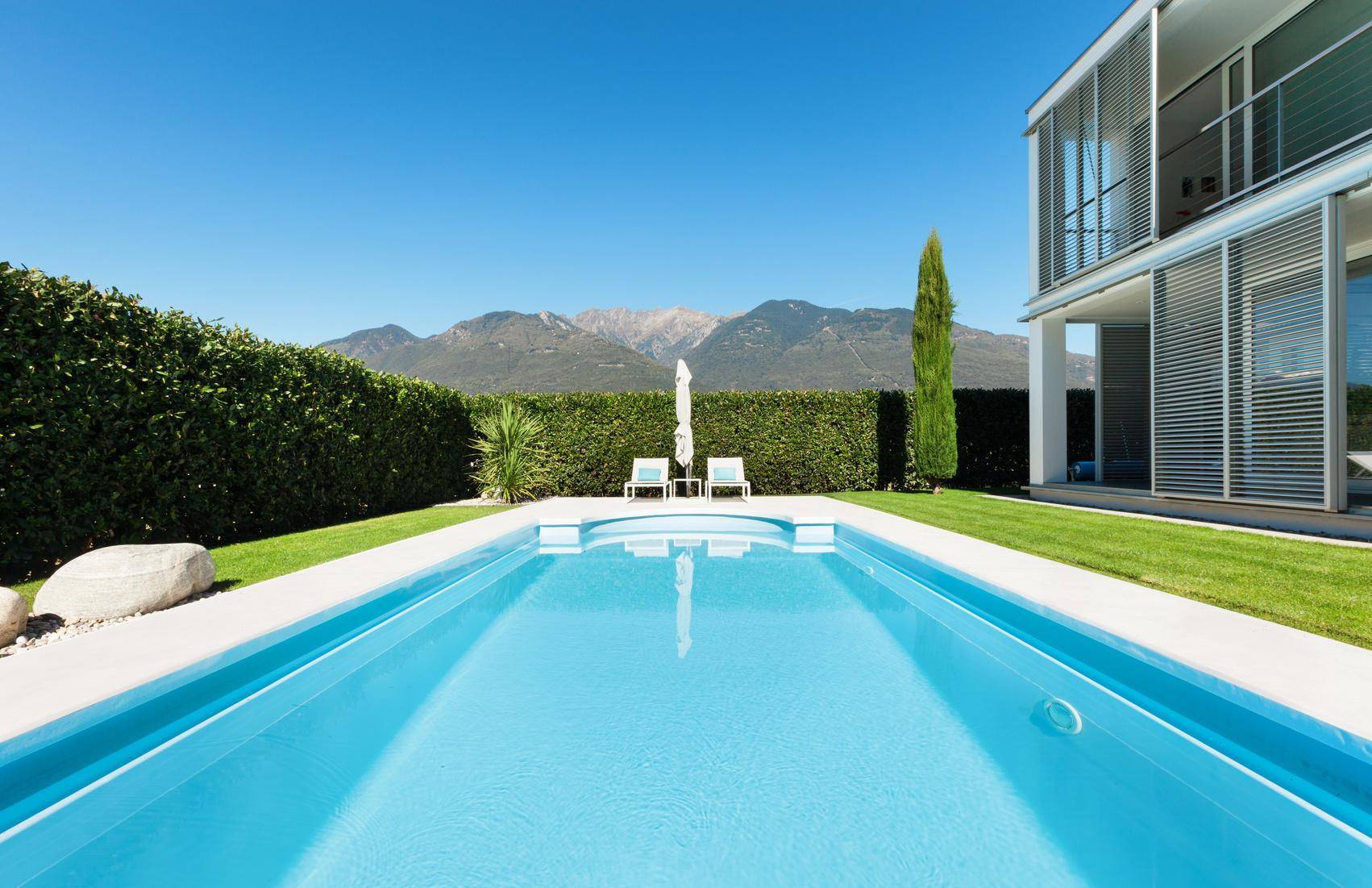 Открытый бассейн на участке у минималистичного дома