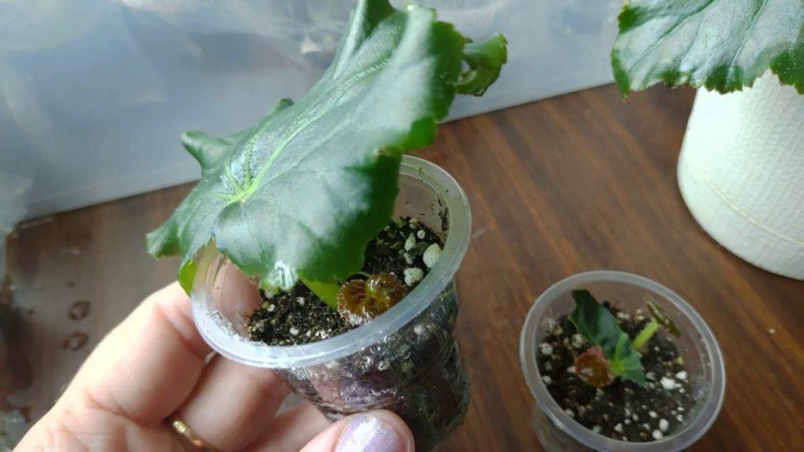 Срез обрабатывают фунгицидом или древесным углем. Заготовку ставят в стакан с мягкой водой или сразу погружают в торфяной субстрат. Корни прорастают спустя месяц. Далее бегонию пересаживают по всем правилам в небольшой горшок, соответствующий размерам корешков.