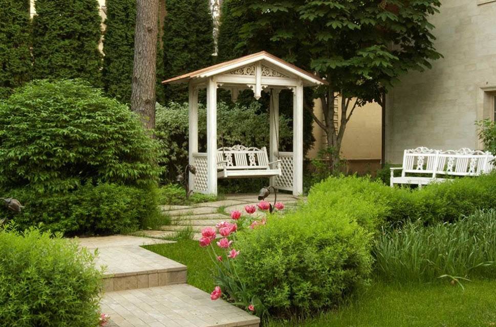 Разные стили ландшафтного дизайна вокруг беседки