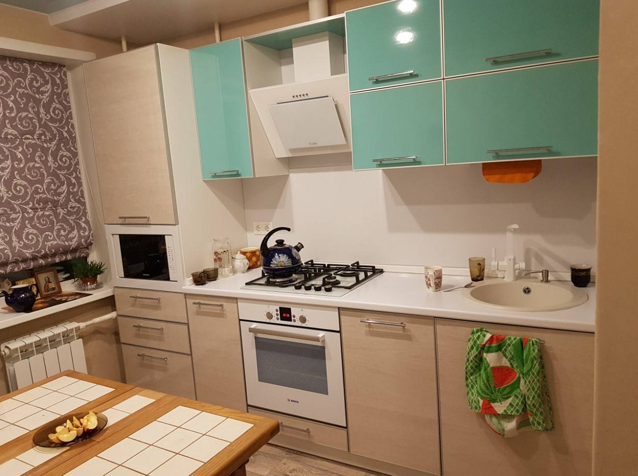 Часто можно встретить именно зеленый (либо салатовый, мятный) гарнитур на фоне светло-бежевых стен.