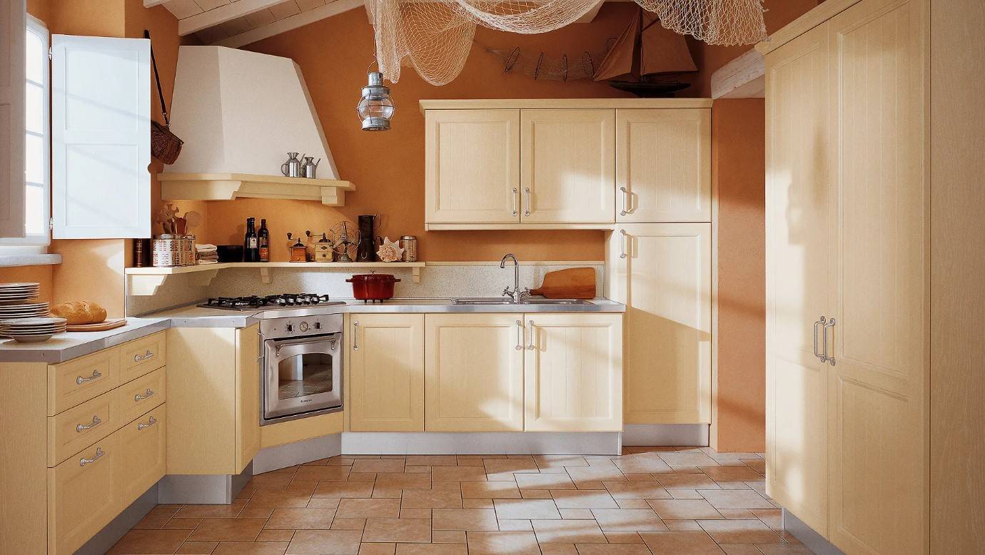 Можно поступить иначе и взять за основу желтые либо розовые стены. В таком случае следует подобрать бежевый гарнитур, а деревянные столешница и фартук составят единую композицию, тщательно выдержанную в актуальном эко-стиле.