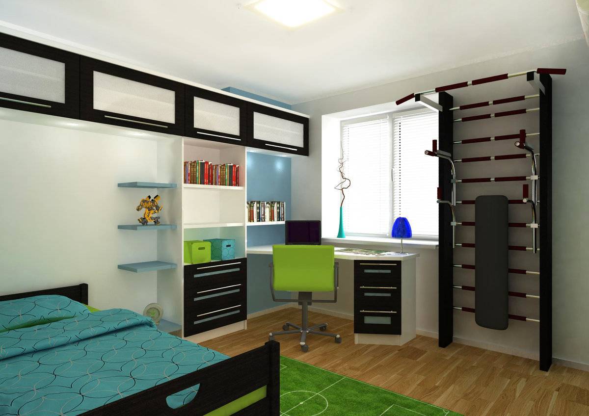 Если комната достаточно просторная, выделите место для спортивного инвентаря. Например, сделайте такую стенку для тренировок, если подросток увлекается альпинизмом.