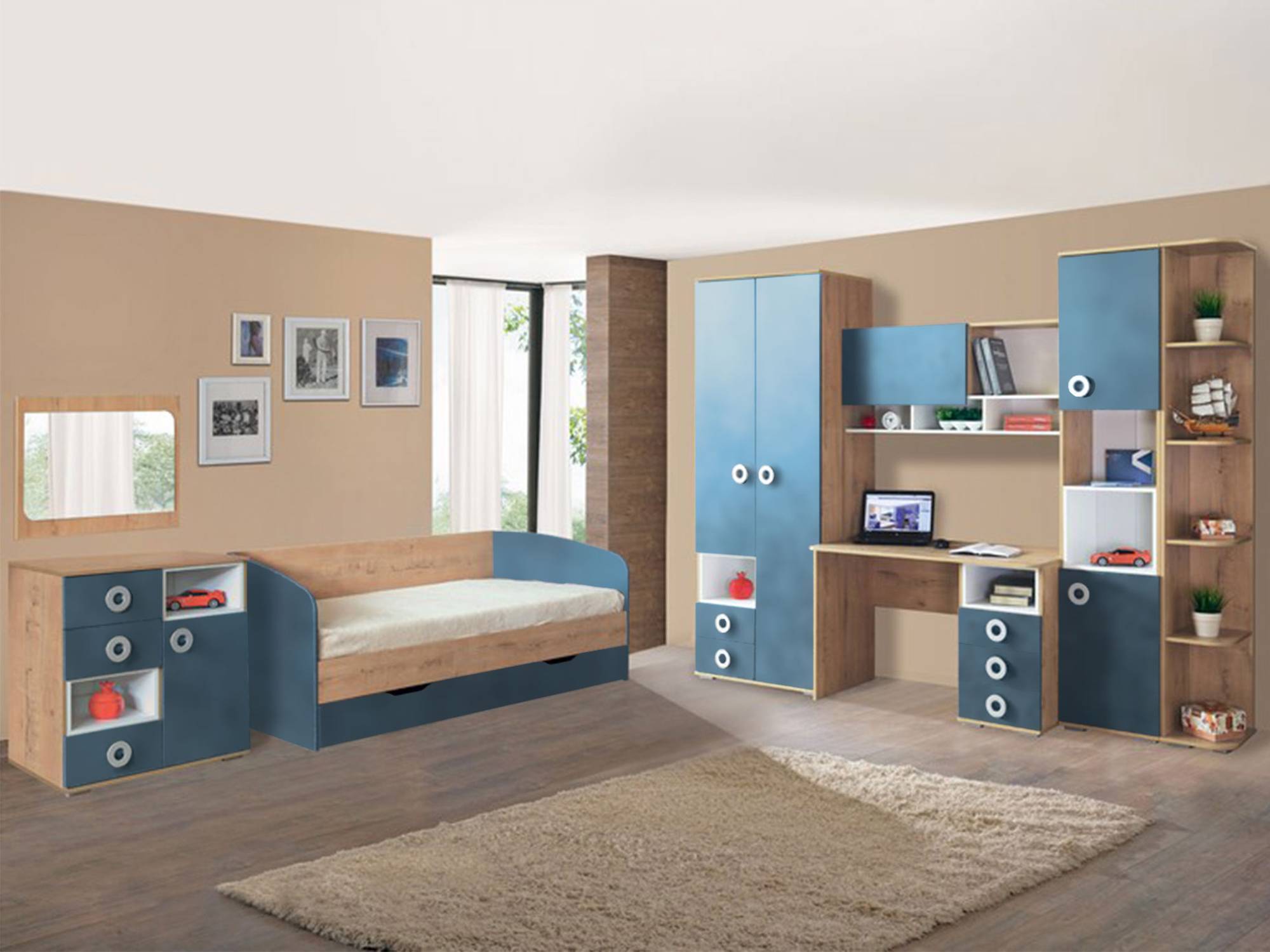 Это стандартный мебельный набор, который дополняется в зависимости от пола и возраста ребенка. Так, комнаты для девочек дополнительно комплектуются ростовым зеркалом, туалетным столиком. Новорожденному и ребенку первого года жизни из мебели нужны только колыбель или кроватка, комод с пеленальным столиком, манеж, игровой коврик. В дошкольном возрасте комната ребенка может быть оснащена игровым или спортивным комплексом, шведской стенкой.