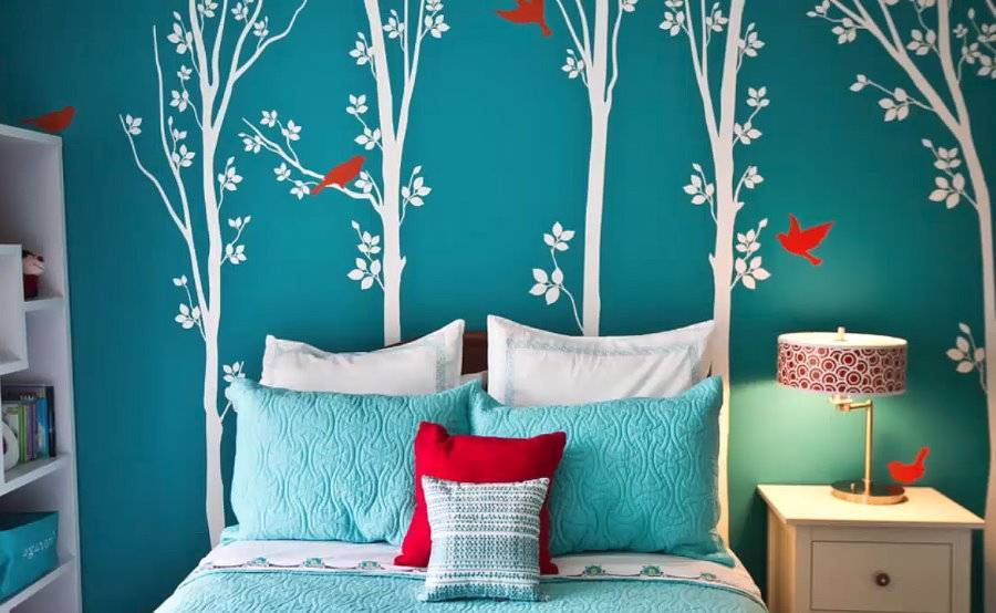 Эффектный декор можно сделать и своими руками, например, нарисовать белые силуэты деревьев на бирюзовой стене