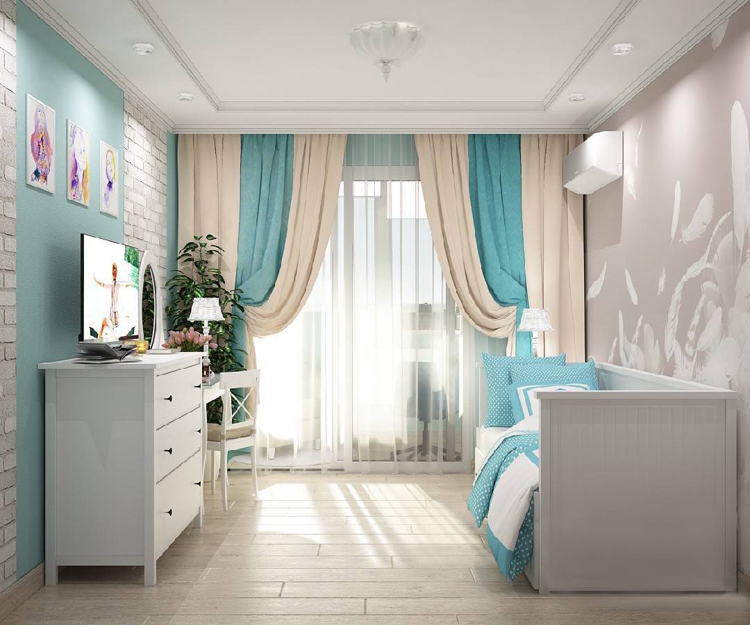 Детская в бирюзовых тонах, предназначенная для девочки, чаще всего оформляется с использованием розового, бежевого, белого, серого цветов. Сочетание бирюзового с белым и светлыми тонами дерева поможет создать классический светлый интерьер, который подойдет молодой девушке.