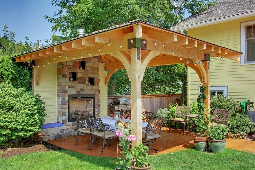 Над патио следует натянуть тент или сделать навес. Такой шаг позволит с комфортом проводить время на его территории даже под моросящим дождиком.