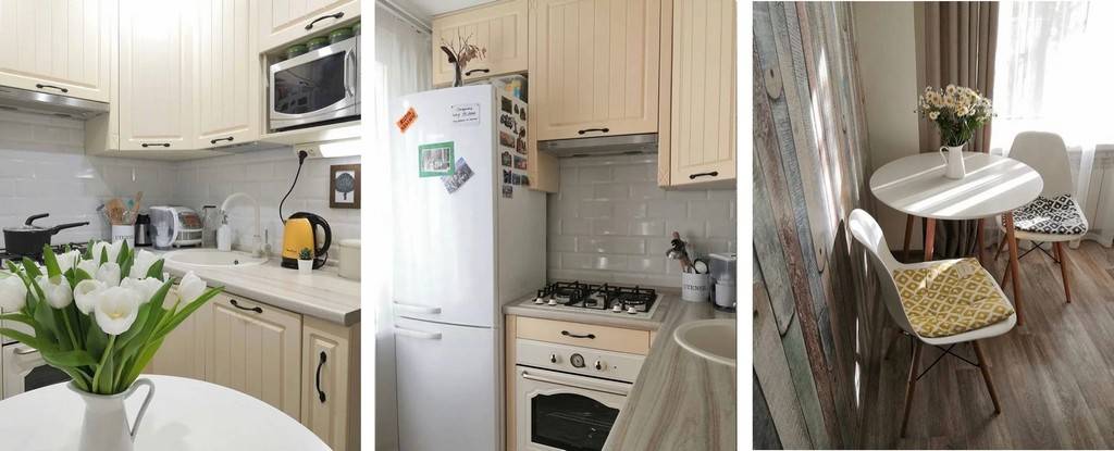Отходим от стереотипов, что квадратный стол более компактный – наоборот, круглый занимает меньше места и отлично дополнит даже маленькую кухню в хрущевке. Кроме того, отсутствие углов положительно сказывается на восприятии пространства, и кухня уже не кажется крошечной, а скорее милой и небольшой.