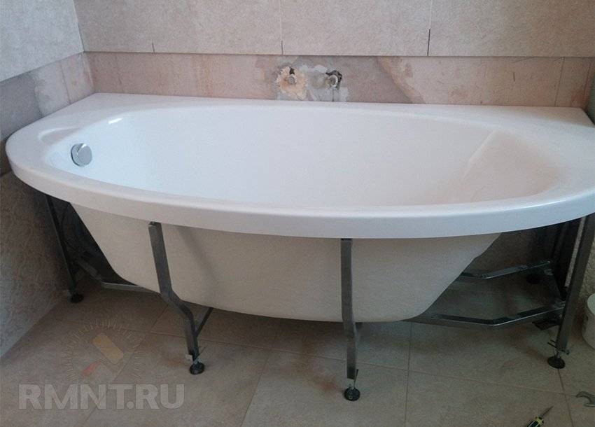 - Для установки ванны монтируется элементы ее крепления к полу (ножки, каркас, подиум и т.д.);