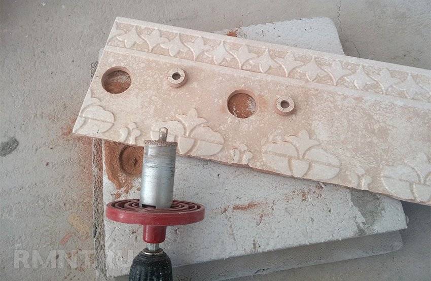 Затем следует укладка плитки, и начать её следует с самого сложного — элемента с вырезкой. Его нужно сделать сразу и точно, поэтому используйте специальное сверло с коронкой для плитки.