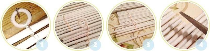 - Также, как и в предыдущих случаях, с помощью дырокола или шила необходимо проделать отверстия и вставить в них шнурки. Для увеличения срока службы жалюзи, нужно обклеить скотчем с тыльной стороны те места, где будет проходить нить или леска для поддержания шторок.