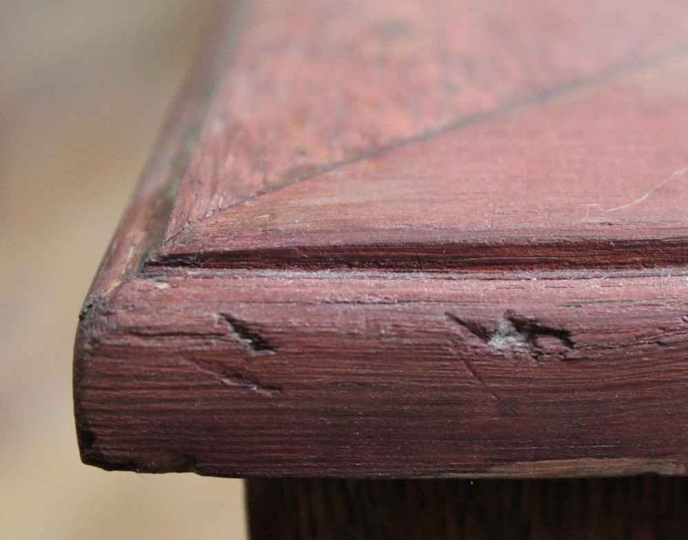 Перед обработкой частей нужно разобрать конструкцию и открутить всю фурнитуру. После этого снимите остатки первоначального покрытия посредством растворителя и шпателя. Старый слой может отходить непросто. В таком случае пропитайте доску растворителем и дайте немного набухнуть. Затем шпателем снимите отслоившийся мусор.
