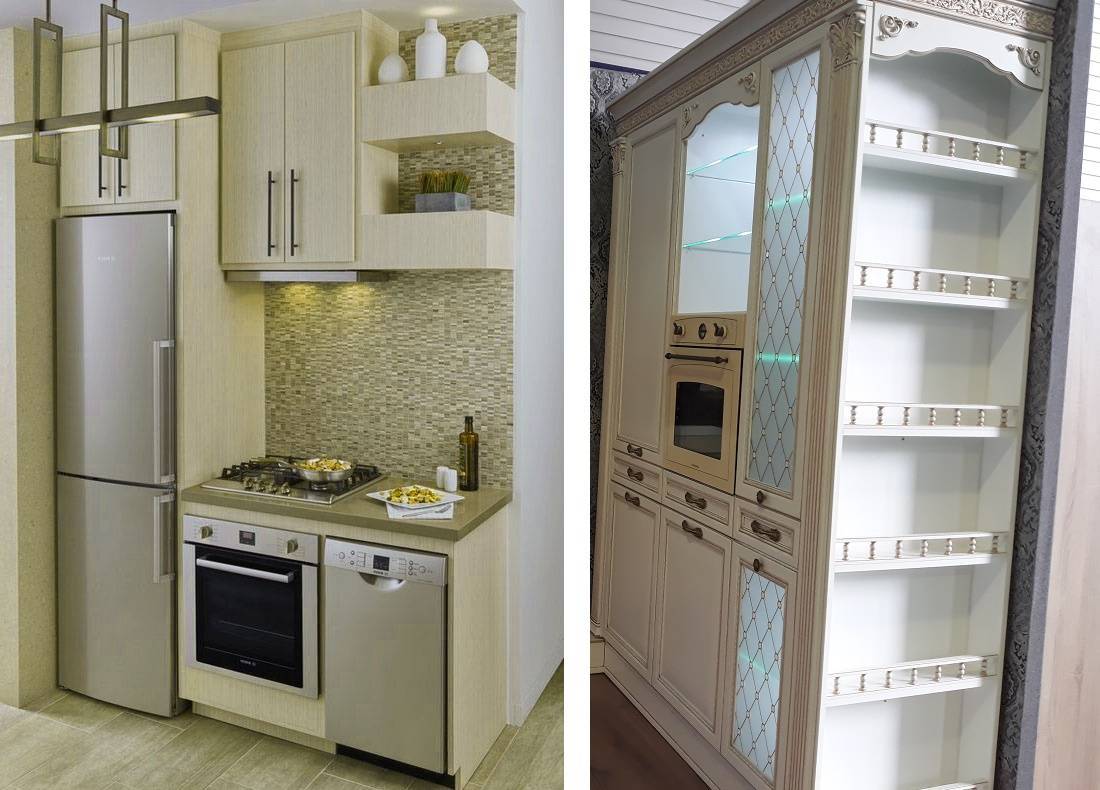 В общем случае оформить торцы кухонных шкафов можно и открытыми полками. Смотрится это решение одинаково уместно и в классическом, и современном стиле интерьера кухни, на малогабаритных и больших пространствах.