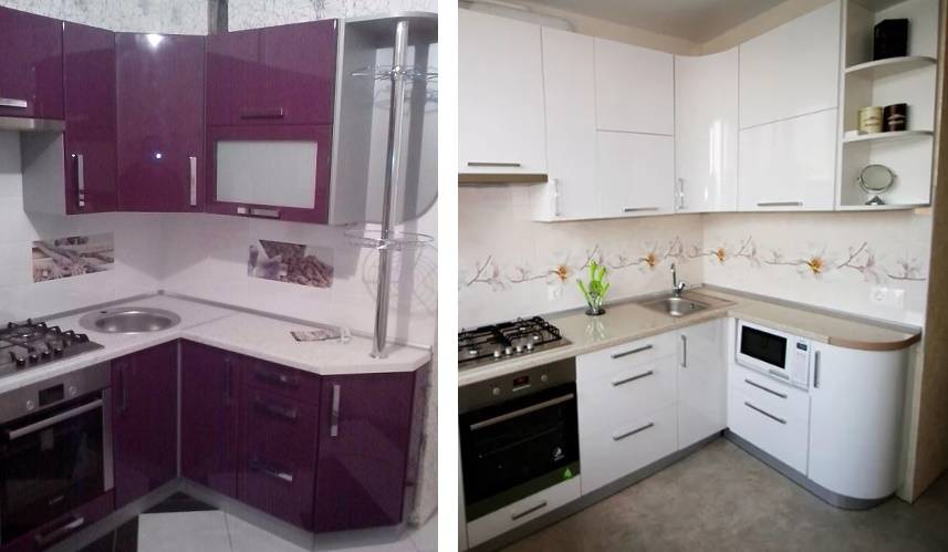 Для «скрадывания» глубины кухонной мебели лучшим приемом остается использование округлых или скошенных модулей. Они могут быть как закрытыми, так и открытыми.
