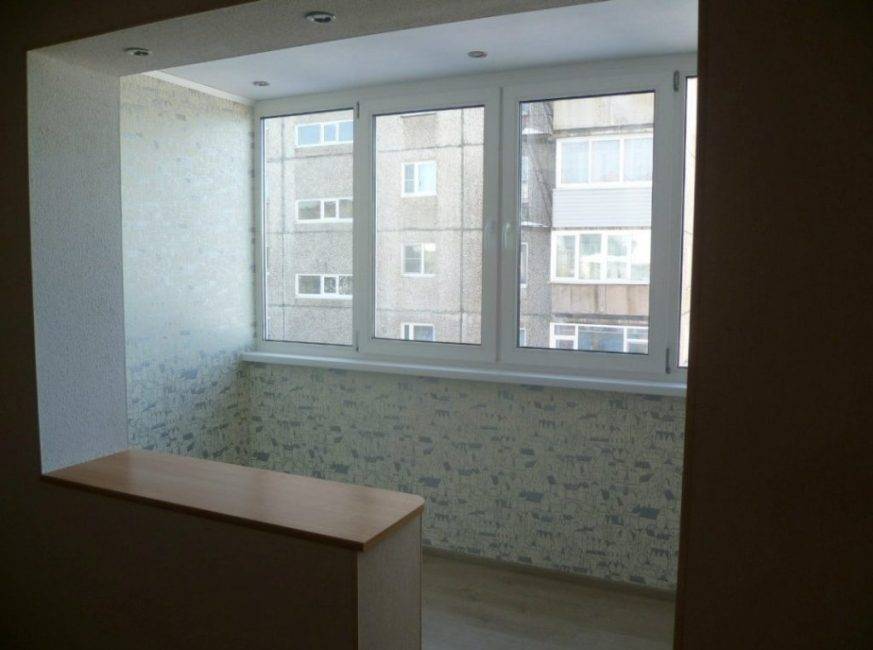 При таком подходе отделка балкона внутри должна перекликаться с оформление кухни. Неплохо смотрится отделка под кирпич в сочетании с гладкими стенами из гипсокартона.