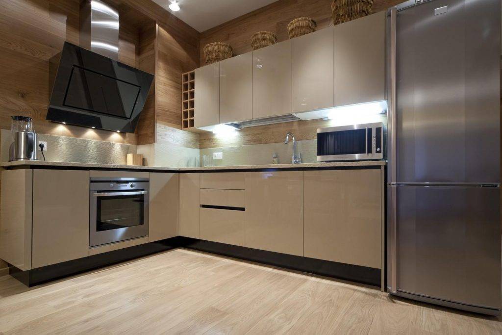 Почему так хороши белые стены? Тени и блики на поверхности черной техники, особенно глянцевой, не будут содержать отраженный свет от цветных стен. Черный цвет станет глубже и более концентрированным. Такой четкий контраст сохранится даже при дневном освещении. Белые полы сделают пространство кухни еще объемней, пропадут границы пола, стен и потолка. Этот прием требует дополнительных зрительных ориентиров , ими часто выступают панорамные окна от пола до потолка. Если панорамных окон на вашей кухне нет, используйте более традиционные варианты пола – деревянный, черно – белую плитку ( четырехугольник или восьмиугольник), светлую плитку с геометрическим узором.