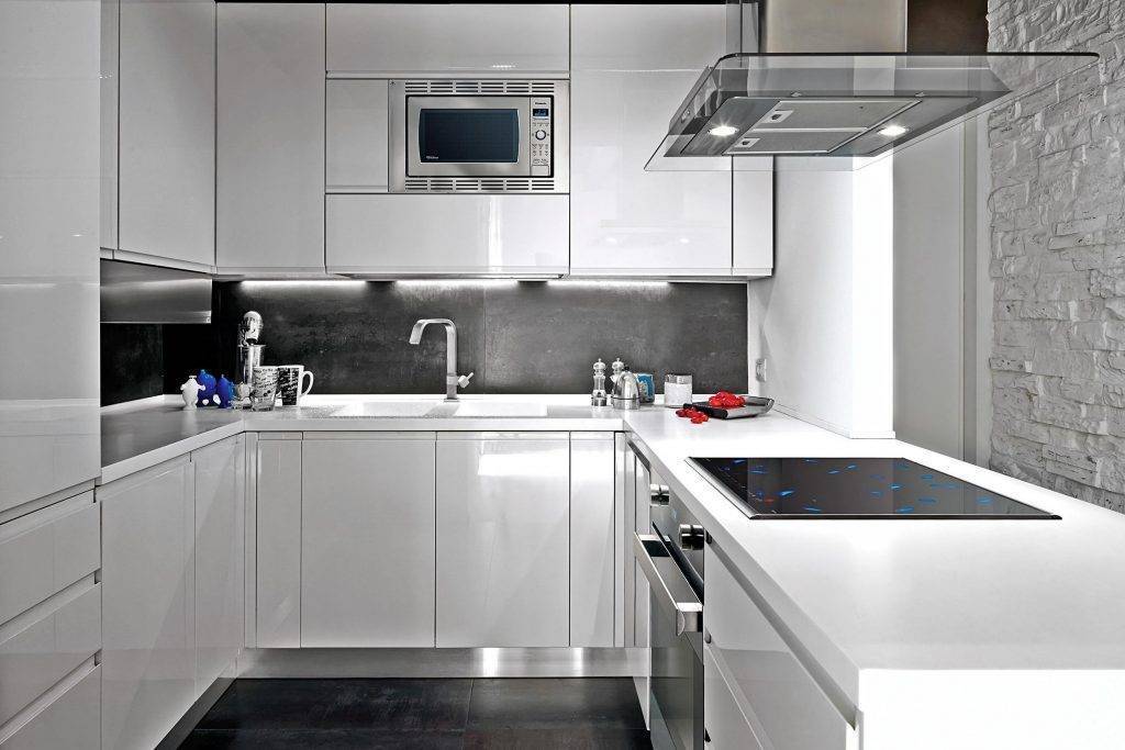 Для почитателей консервативных решений, касающихся оформления такого функционального помещения, как кухня, подходящим вариантом станет мебель с глухими закрытыми напольными и подвесными модулями. Доминирующий белый цвет добавит простора, кроме того, будет поддерживать классическое решение с акцентом на чистоту и порядок. Интересным решением, разбавляющим белоснежное убранство, окажется глянцевый черный фартук и столешница, которые выступят в качестве контрастной границы, которая будет делить кухню на две части по горизонтали. В подобный минималистический стиль прекрасно впишется бытовая техника последнего поколения с металлическим корпусом.